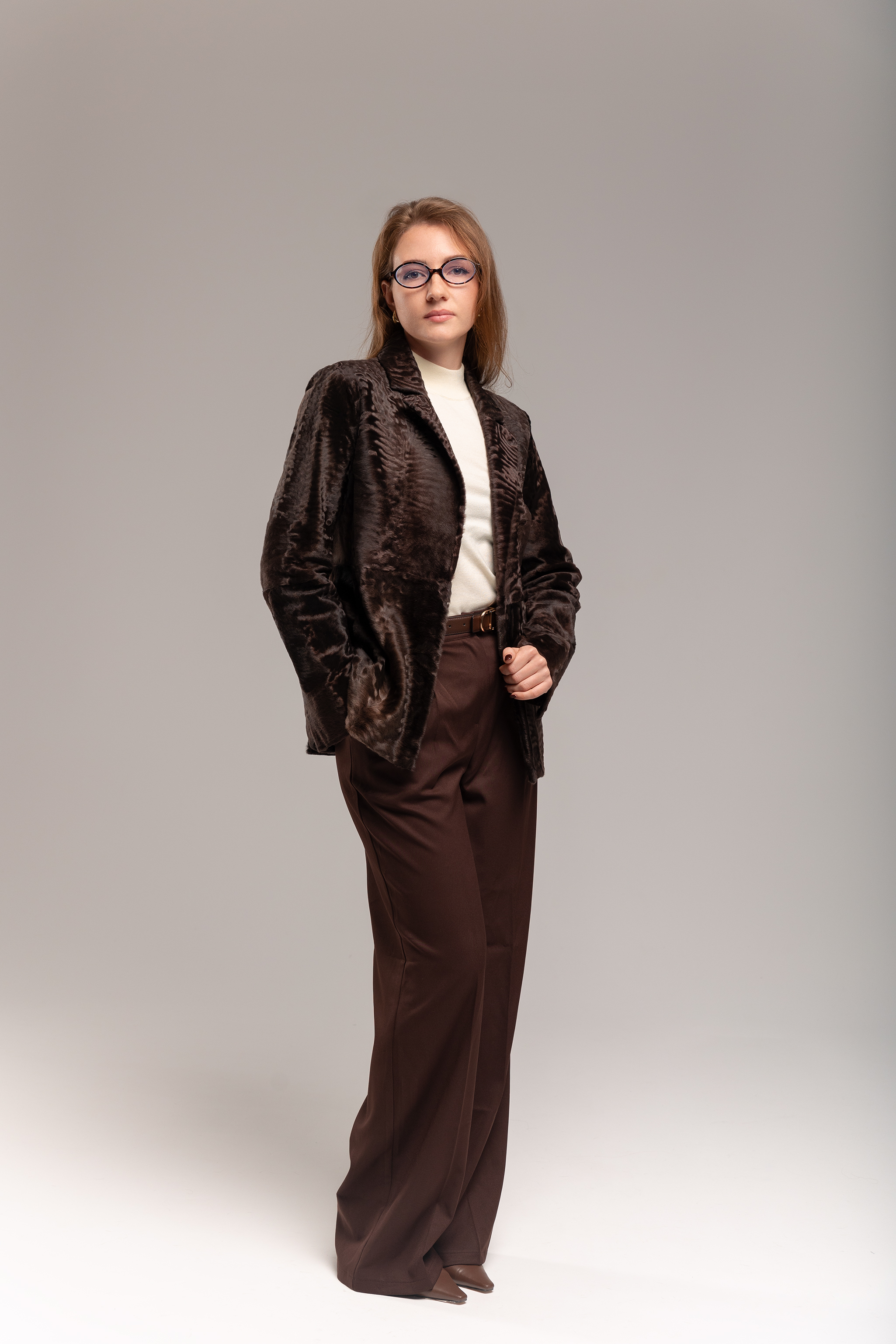 Жакет выполнен из шелковистой афганской каракульчи в шоколадном цвете