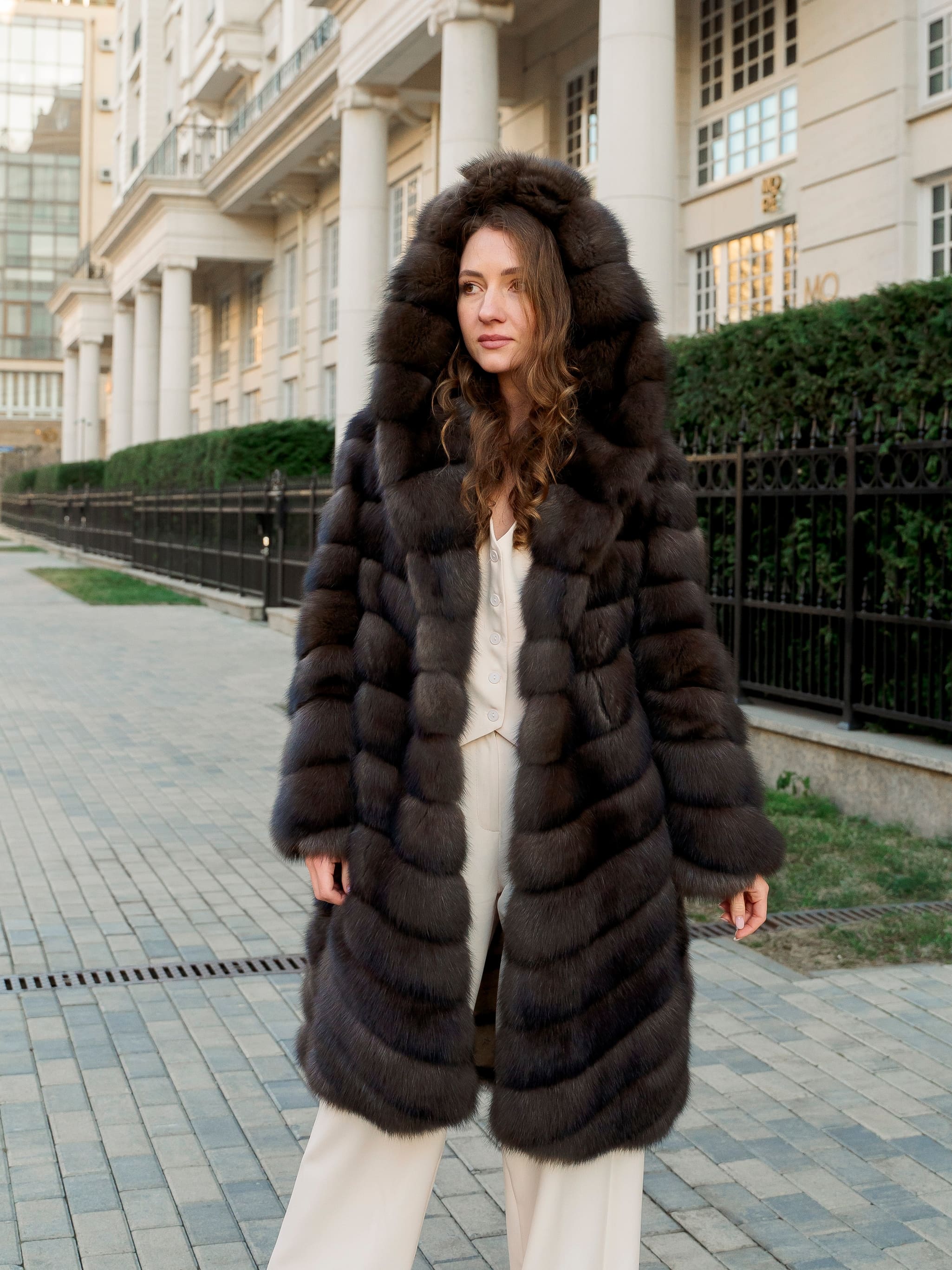 Шуба из баргузинского соболя в натуральном цвете с капюшоном