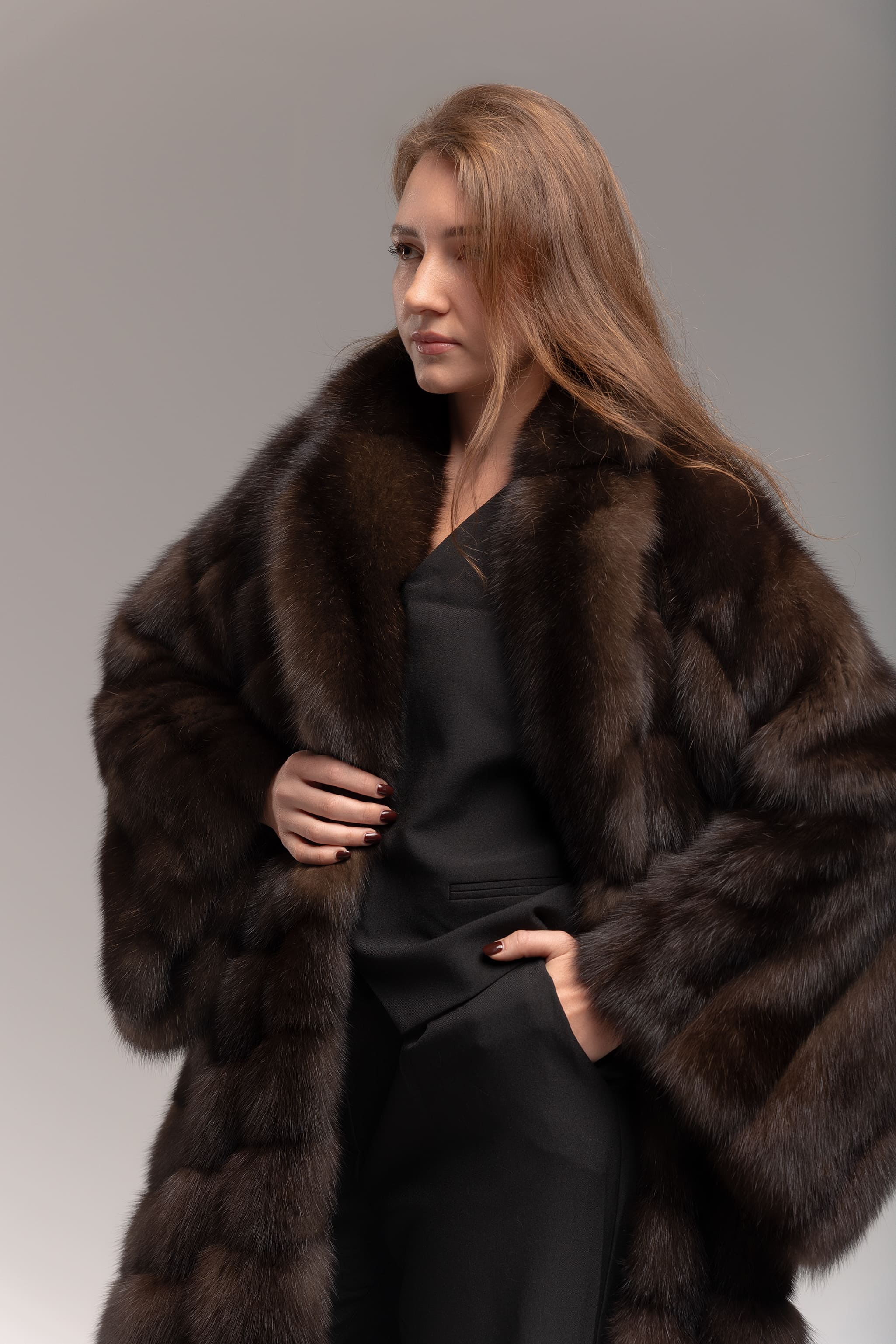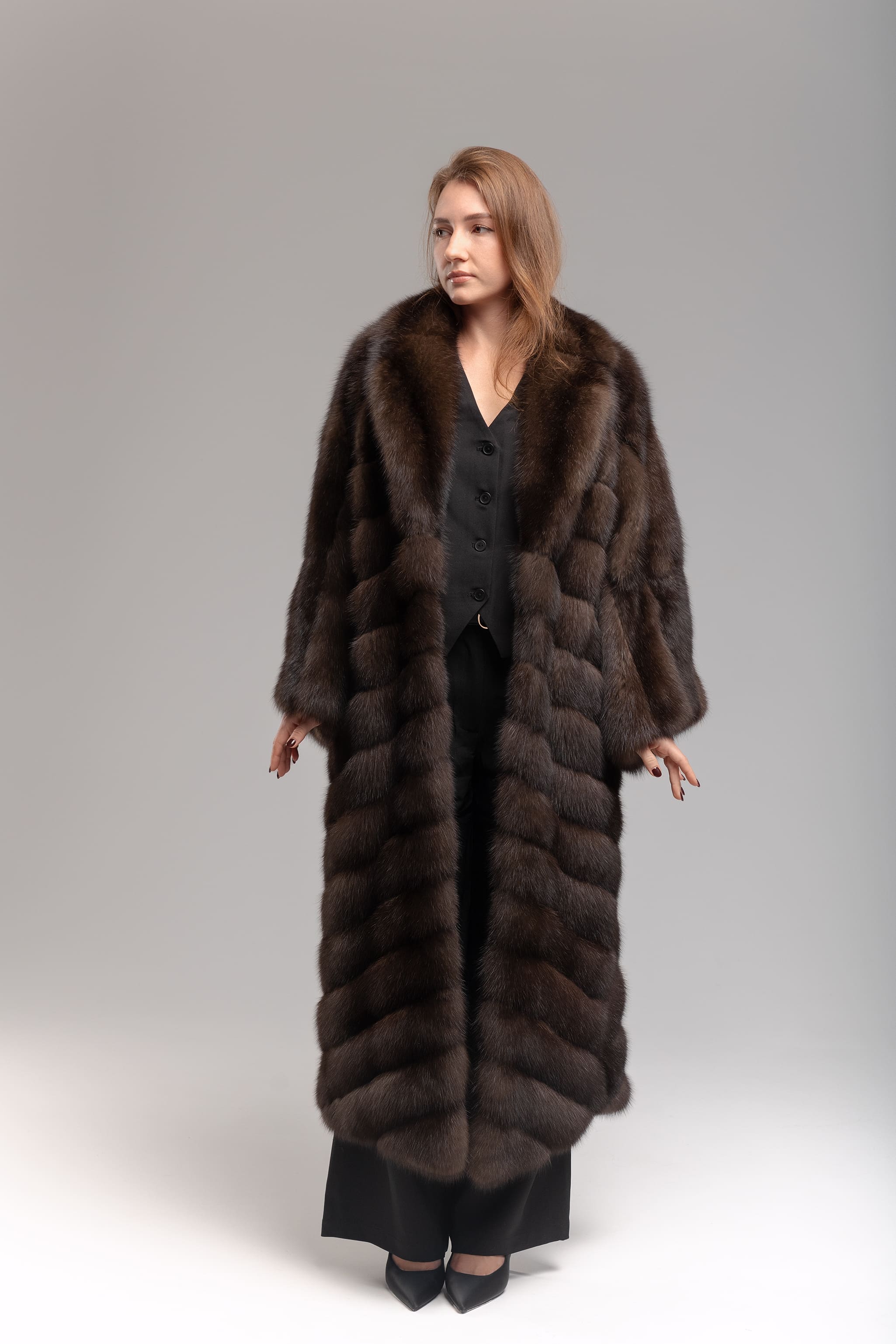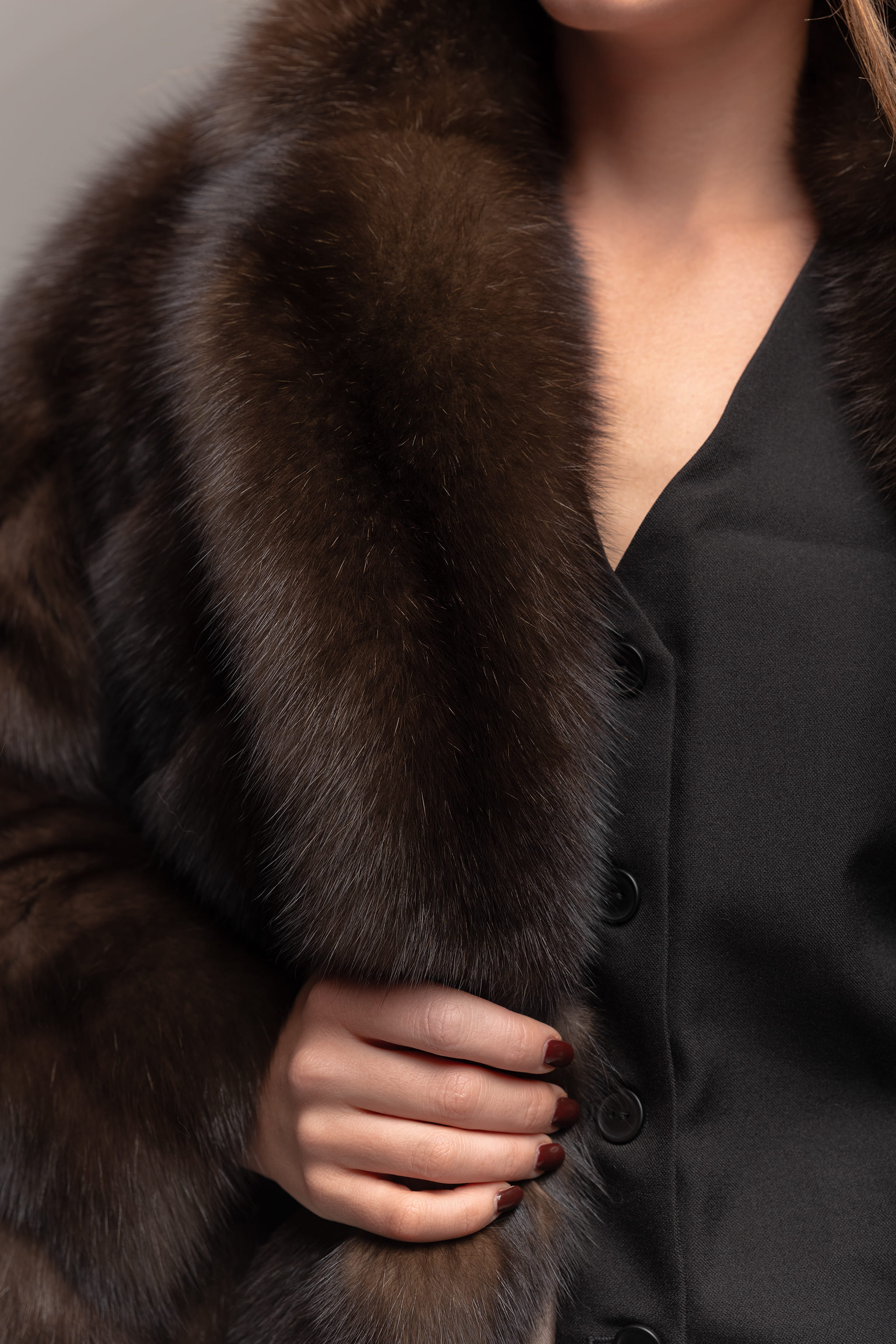 Шуба выполнена из дикого баргузинского соболя в цвете №3 и седине №2/3