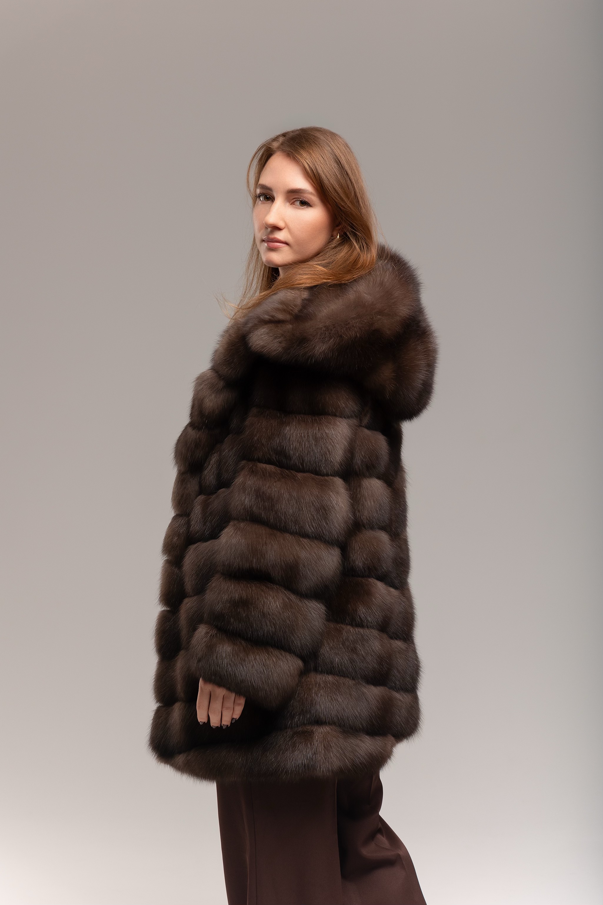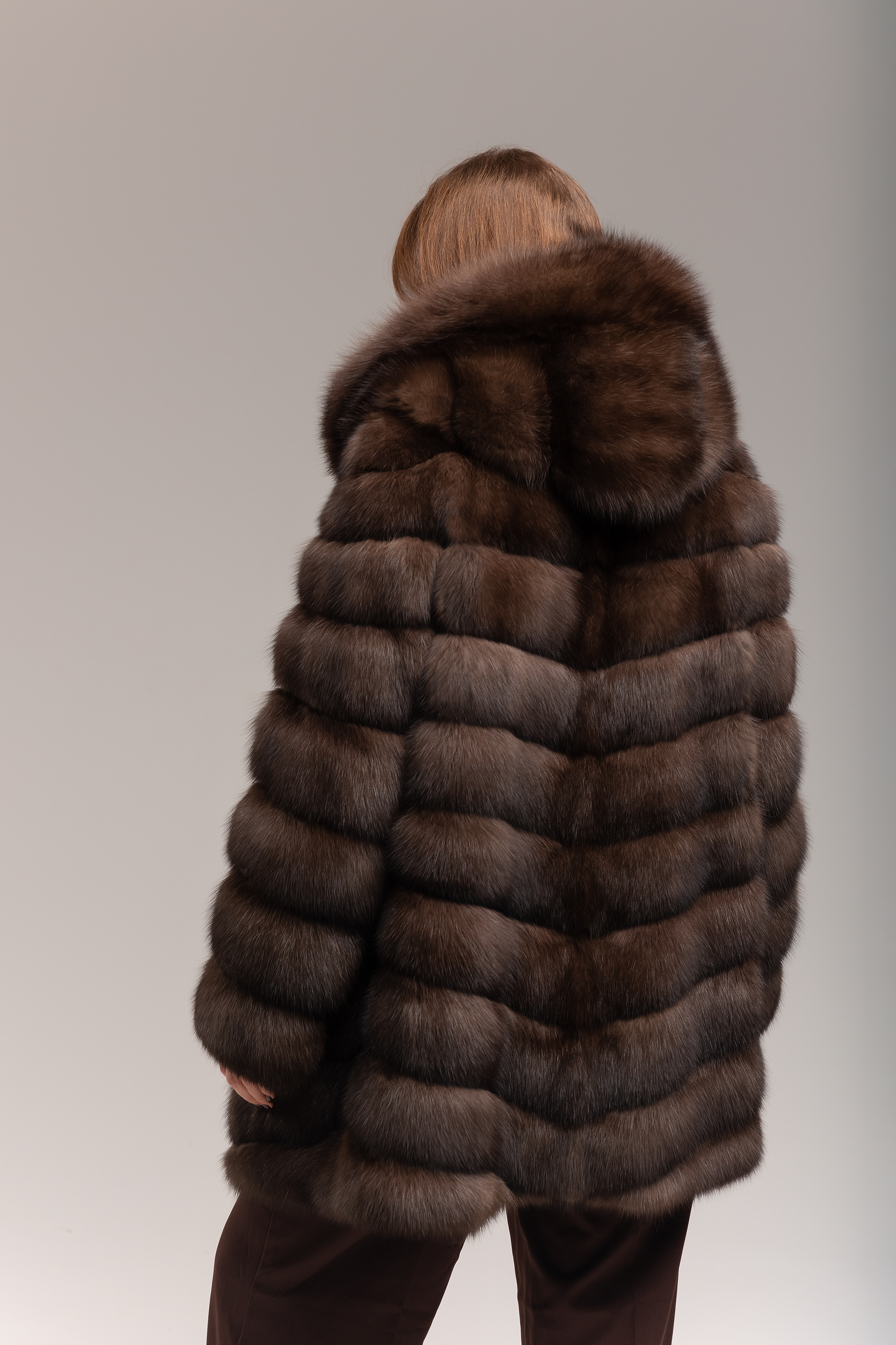 Шуба из темного соболя с капюшоном 60см
